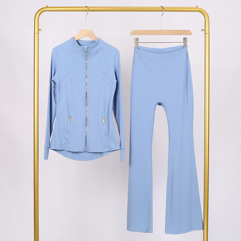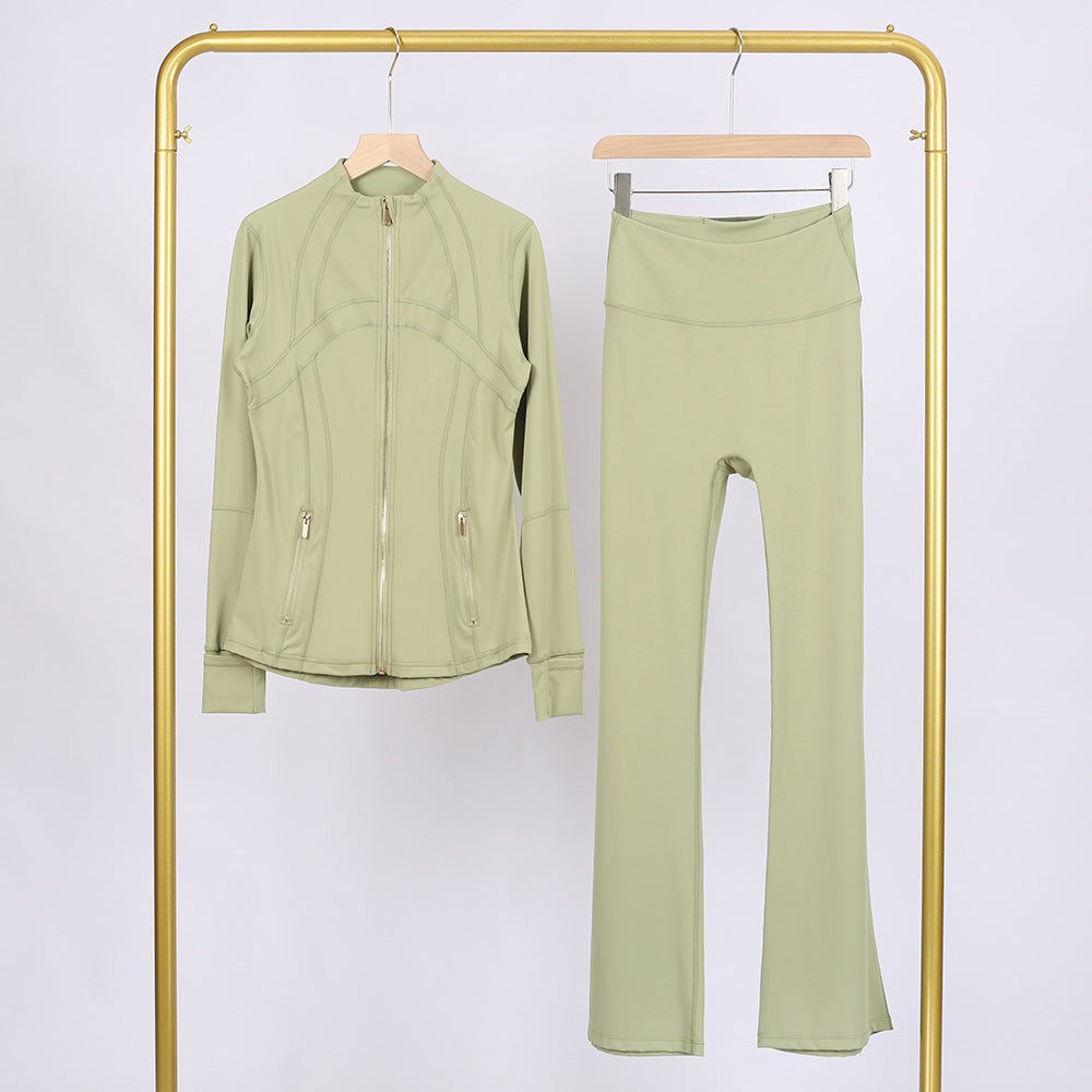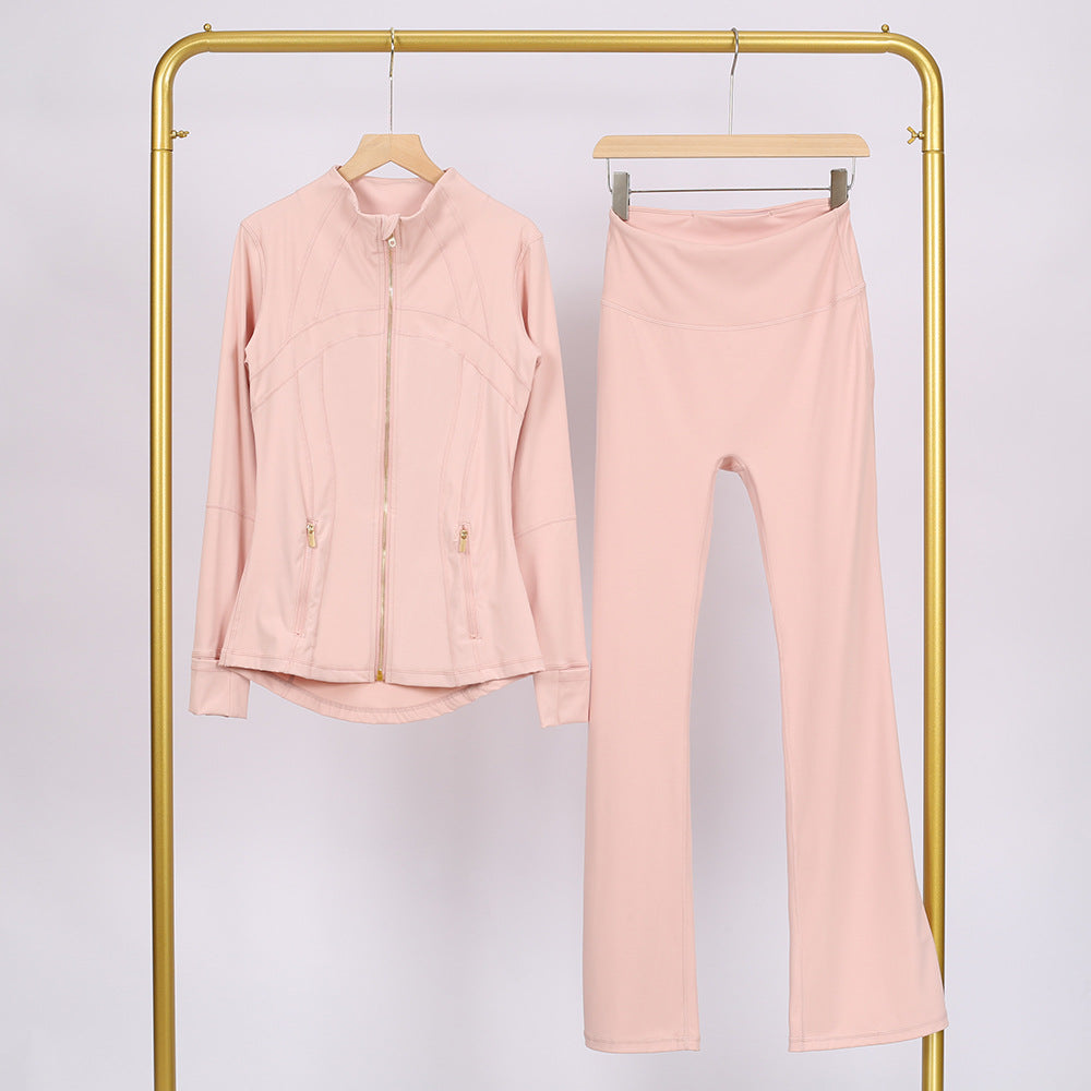 This fitness yoga set features a slim-fit jacket with a stand-up collar and a convenient golden zipper, paired with cropped bell-bottom pants. Made from elastic, quick-drying fabric, it ensures comfort and flexibility during your workouts while keeping you stylish.